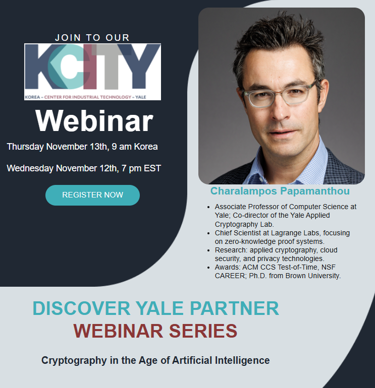 Charalampos Papamanthou is an Associate Professor of Computer Science at Yale University, where he co-directs the Yale Applied Cryptography Laboratory. He also serves as Chief Scientist at Lagrange Labs, a startup advancing systems and applications for zero-knowledge proofs. Prior to joining Yale, he was Director of the Maryland Cybersecurity Center (MC2) and Associate Professor of Electrical and Computer Engineering at the University of Maryland, College Park, which he joined in 2013 after completing a postdoc at UC Berkeley. Papamanthou’s research focuses on applied cryptography and computer security, with a particular emphasis on systems, theory, and technologies for secure and private cloud computing. His contributions to the field have been widely recognized. In 2022, he received the ACM CCS Test-of-Time Award for his work on searchable encryption. He is also the recipient of numerous honors, including the NSF CAREER Award, the JP Morgan Faculty Research Award, the Google Faculty Research Award, the Yahoo! Faculty Engagement Award, two NetApp Faculty Fellowships, the UMD Invention of the Year Award, the Jimmy Lin Award for Invention, and the George Corcoran Award for Excellence in Teaching. He was a finalist for the 2020 Facebook Privacy Research Award. His research has been supported by both government agencies (NSF, NIST, NSA) and industry leaders (including JP Morgan, Google, Yahoo!, NetApp, VMware, Amazon, Algorand, Ergo, Ethereum, and Protocol Labs). Papamanthou holds a PhD in Computer Science from Brown University (2011) and an MSc from the University of Crete (2005), where he was affiliated with ICS-FORTH. His work, which spans applied and theoretical cryptography, systems and database security, graph algorithms, and operations research, has been cited close to 15,500 times. |